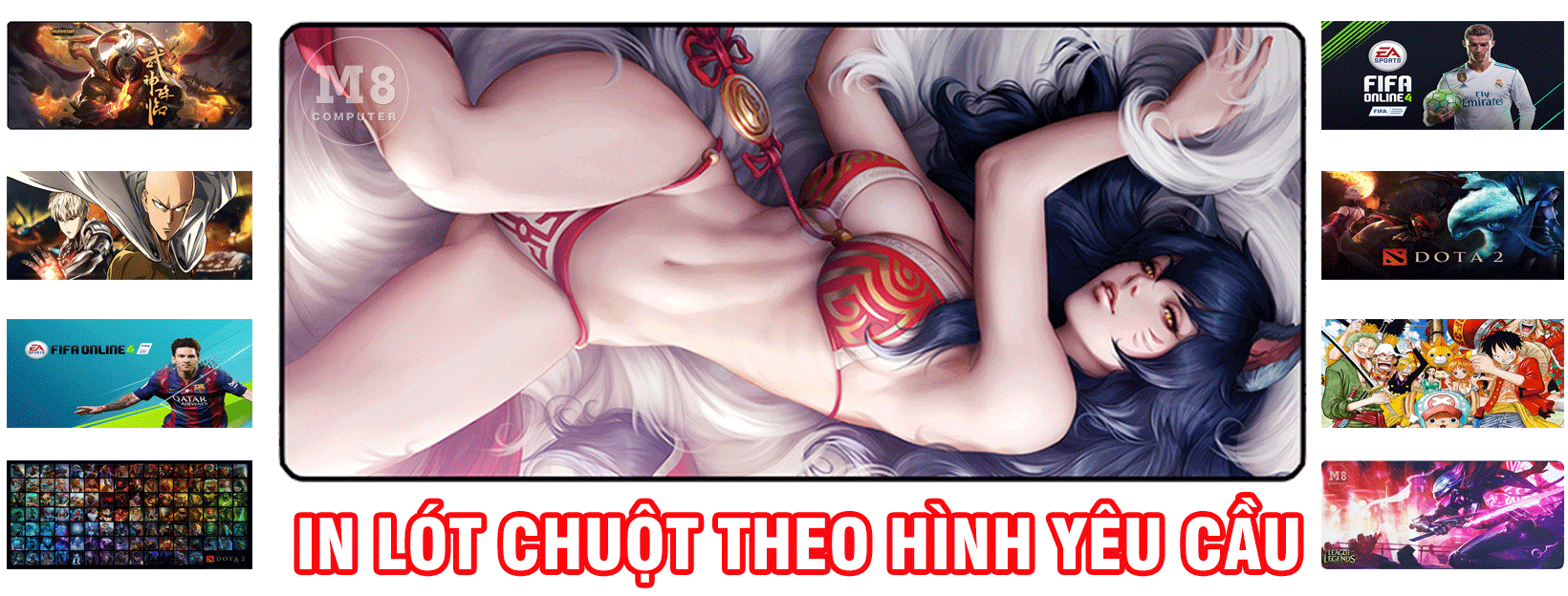 - M8 Computer Chuyên Dịch Vụ In Lót Chuột Theo Yêu Cầu "lấy ngay" trong ngày tại Hà Nội - Shop nhận in mọi hình ảnh anh em muốn từ số lượng 1 tấm đến hàng nghìn tấm từng kích thước theo yêu cầu với các kích thước cụ thể như: 21x26cm, 25x30cm, 40x45cm hoặc 30x80cm. Cam kết với anh em lót chuột in theo yêu cầu ra không bị mờ, phai màu sau thời gian sử dụng.